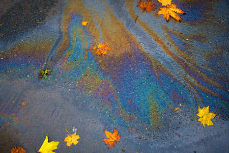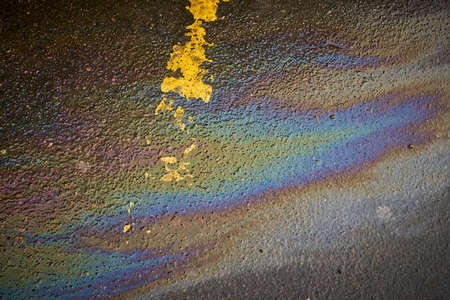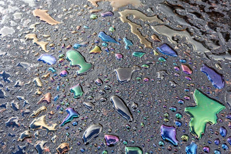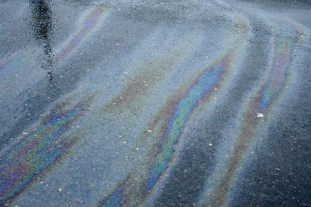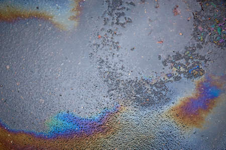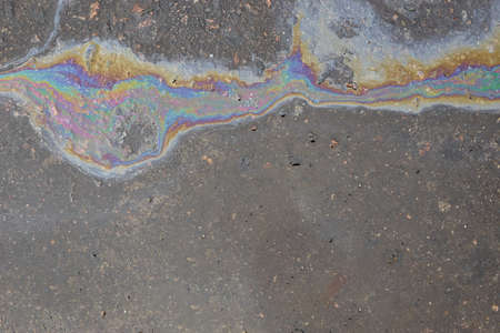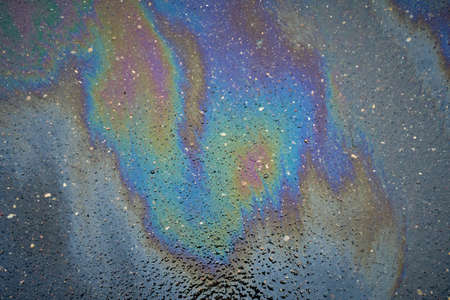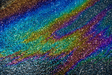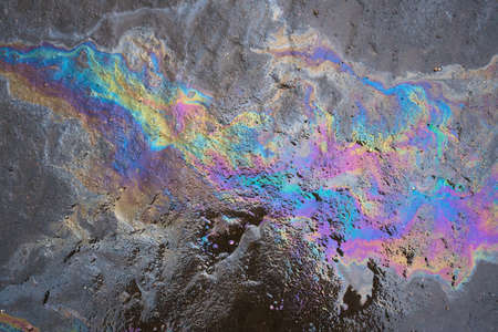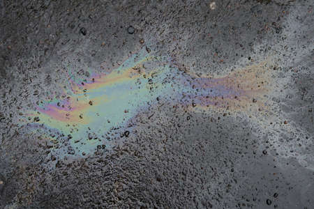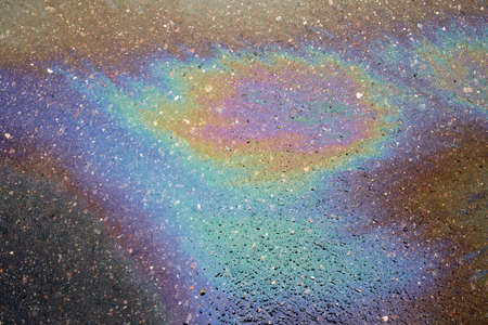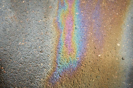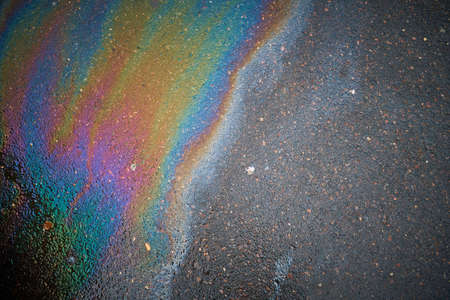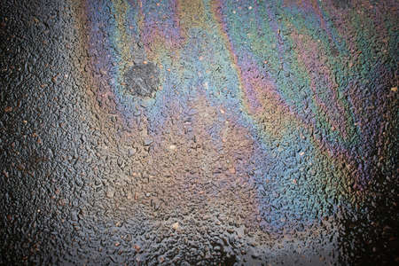 Abstract rainbow effect background, colorful gas stain on wet asphalt caused by a leak under a car or truck