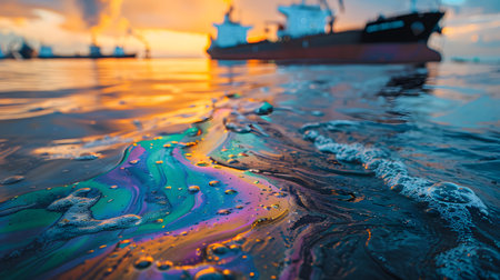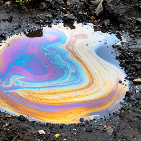 Oil slick on water forming abstract iridescent patterns and colorful bubbles, symbolizing environmental pollution