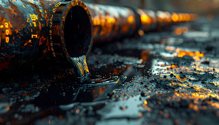 A close-up shot captures the thick, viscous crude oil as it drips from a corroded industrial pipe, forming a dark, reflective puddle.