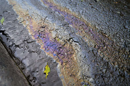 Oil stain on Asphalt, color Gasoline fuel spots on Asphalt Road as Texture or Background. Soft focus