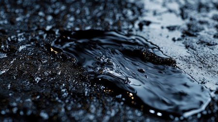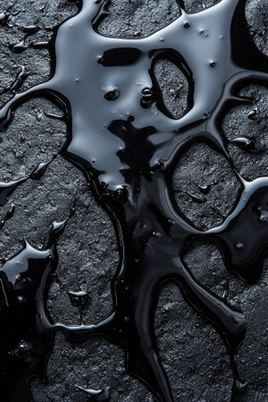Close-up view of a dark puddle of liquid displaying a glossy finish, with subtle reflections and delicate water droplets on an abstract surface.