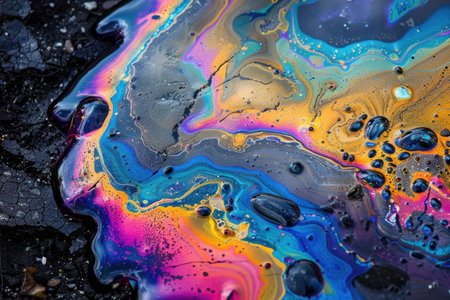 Colorful iridescent oil slick on a textured dark surface, showcasing vibrant patterns and shimmering hues. Nature and environmental concept, focusing on fluid dynamics.
