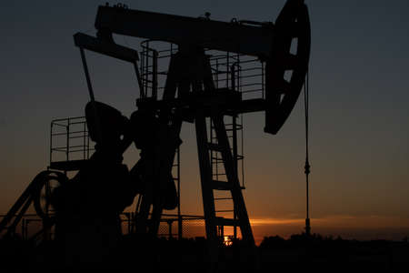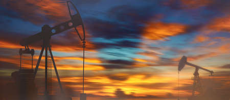 Oil pump jacks at sunset sky background.