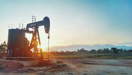 Oil pump oil rig energy industrial machine for petroleum in the sunset background