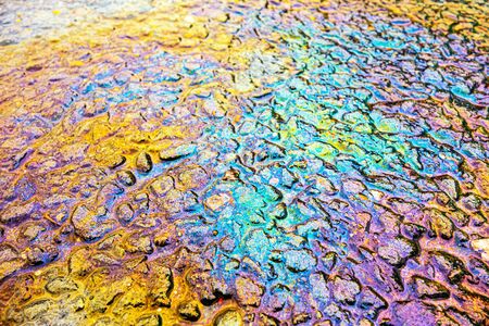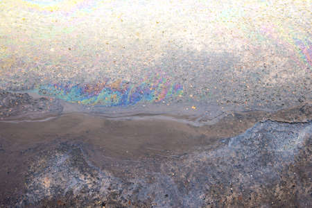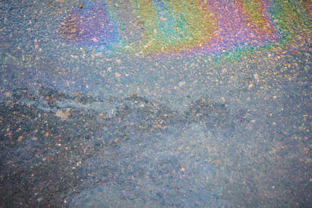 Texture of gasoline spilled on asphalt wet after rain in rainbow colors. Surface of the road with leaking petroleum. Concept of environmental pollution.