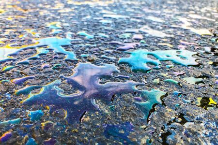Oil stain on Asphalt, color Gasoline fuel spots on Asphalt Road as Texture or Background. Soft focus
