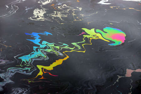 Gasoline or oil spill creating colorful swirls on water surface, polluting the environment and causing ecological damage