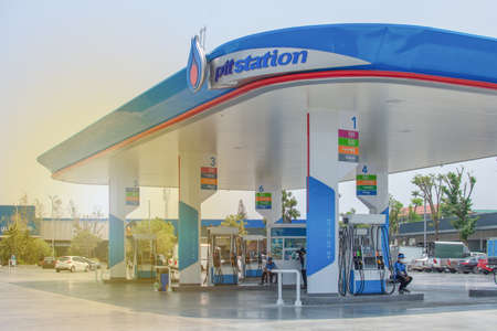 Samutsakhon, Thailand - 3 March,2020 : PTT petrol station with a lot of car in sunset time