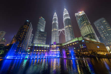 KUALA LUMPUR, MALAYSIA - FEBRUARY 28, 2018: View on the lake Symphony and the Petronas twin towers at night on February 28, 2018 in Kuala Lumpur, Malaysia.