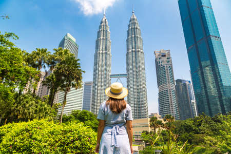KUALA LUMPUR, MALAYSIA - FEBRUARY 25, 2020: Woman traveler at Petronas Tower in a sunny day in Kuala Lumpur, Malaysia