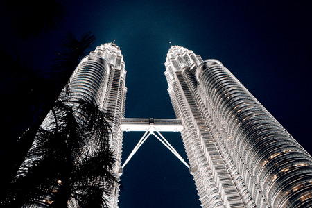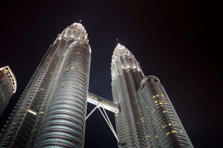 Malaysia - 17 MAY 2013: Petronas Twin Tower building with lighting on building photo taken from below at night time in Kuala Lumpur Malaysia