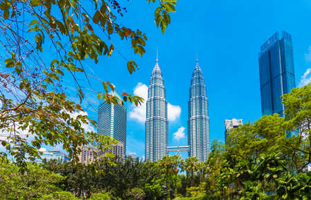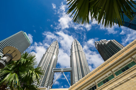 Kuala Lumpur, Malaysia - July 30, 2019: The low angle view of the Petronas Twin Towers or KLCC in the city surrounding with tall skyscrapers and clear cloudy blue sky during the day.