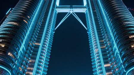 Twin towers with blue neon lights at night