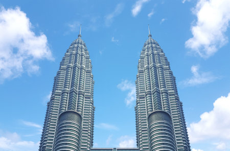 KUALA LUMPUR, MALAYSIA - 31 AUGUST, 2016: The Petronas Twin Towers at KLCC City Center on a cloudy day and blue sky. The most popular tourist destination in Malaysian capital.