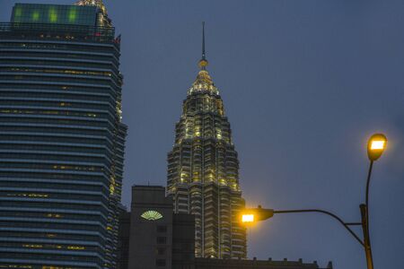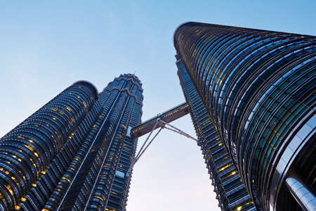 Kuala Lumpur, Malaysia - July 30, 2019: The low angle view of the Petronas Twin Towers or KLCC in the city during the evening.