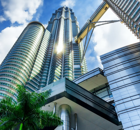 Kuala Lumpur, Malaysia - July 30, 2019: The low angle view of the Petronas Twin Towers or KLCC in the city surrounding with tall skyscrapers and clear cloudy blue sky during the day.