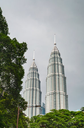 KUALA LUMPUR, MALAYSIA. MARCH 18, 2016. Twin tower with trees foreground in Kuala Lumpur, Malaysia.