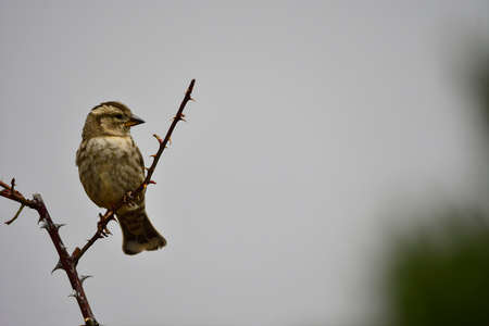 Bird sparrow spring sitting on prickly bush background
