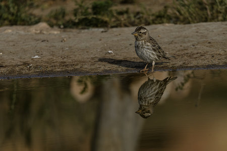 A rock sparrow (Petronia petronia) standing at the edge of a water source, with its reflection mirrored on the surface.