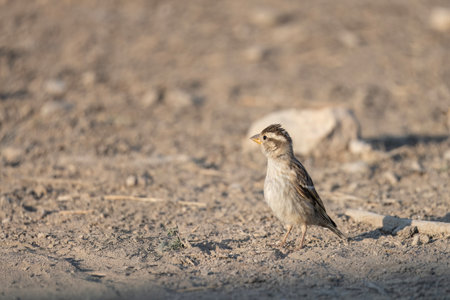 Rock sparrow on bare earth with blurred background in soft morning light
