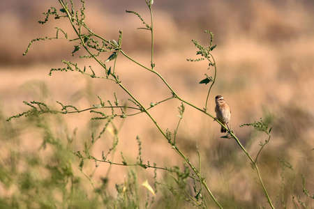 Little sparrow sitting on a tree in a field at sunset.