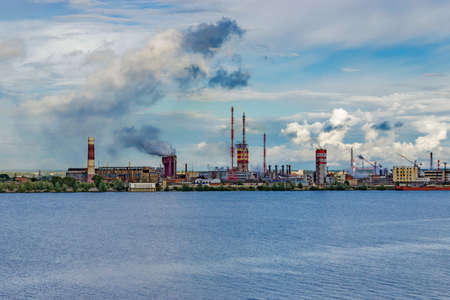 Panoramic view from above of a large industrial city by the river in winter. High quality photo