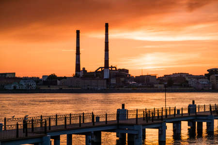 View of the city of Khabarovsk from the Amur river. Urban landscape in the evening at sunset.