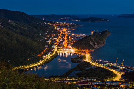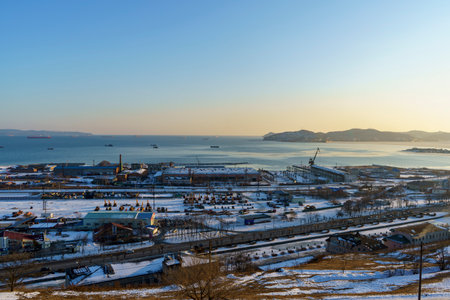 Vladivostok, Russia - Jun 11, 2020: view of the Amur Bay at sunset.
