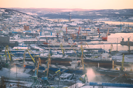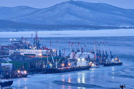 MURMANSK, RUSSIA - FEBRUARY 21, 2019: View of the cargo port on a February evening