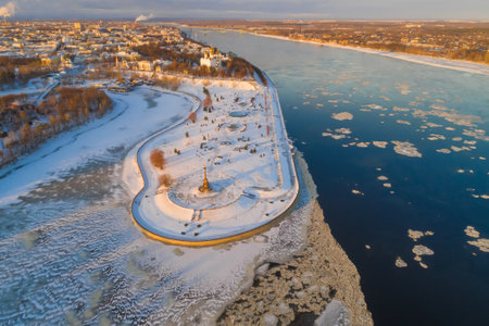 YAROSLAVL RUSSIA - JANUARY 01, 2020: Aerial view of the Volga and Kotorosl rivers on a January evening (aerial photography). Golden Ring of Russia