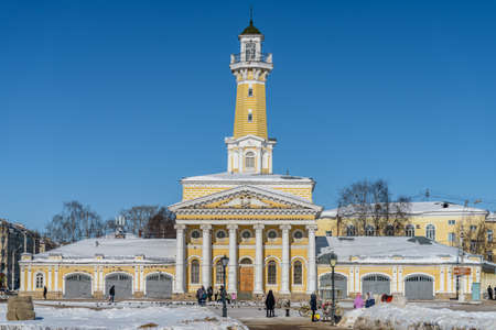 Kostroma, Russia - March 3, 2018. Kostroma Fire Tower on Susaninskaya Square. Sunny cold day on early russian spring.