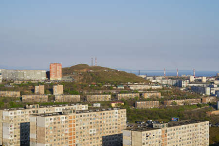 Autumn panorama view of Kamchatka city landscape, old Soviet residential building of Petropavlovsk-Kamchatsky City on sunny clear day with blue sky. Eurasia, Russian Far East, Kamchatka Peninsula.