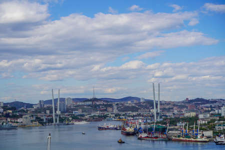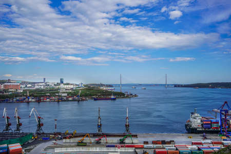 Vladivostok, Russia-may 11, 2020: Industrial landscape with a view of the port, containers, cranes and ships on the background of the Golden horn Bay.