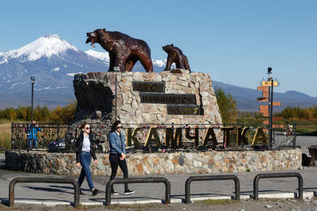 YELIZOVO CITY, KAMCHATKA PENINSULA, RUSSIA - SEP 24, 2017: Sculpture composition of Kamchatka brown bear family