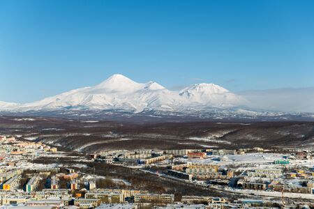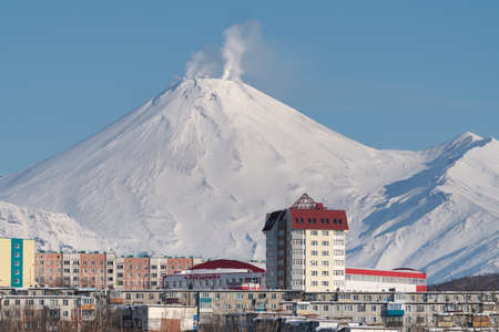 Winter city scape of Petropavlovsk-Kamchatsky City, fumaroles activity of active Avachinsky Volcano in sunny weather with clear sky. Petropavlovsk City, Kamchatka Peninsula, Russia - January 23, 2020.