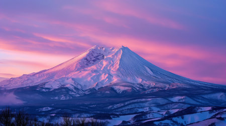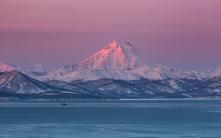 Winter volcanic landscape of Kamchatka Peninsula at purple-violet sunset: active Avacha Volcano erupting gas, ash - popular attraction, travel destinations. Eurasia, Russian Far East, Kamchatka Region