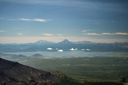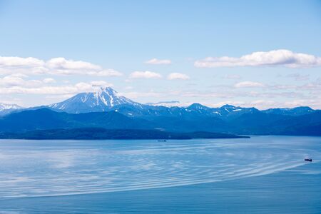 Beautiful summer Kamchatka landscape: view from city PetropavlovskKamchatsky on Avachinskaya Bay Avacha Bay and cone Vilyuchinsky Volcano. Russia Far East Kamchatka Peninsula.