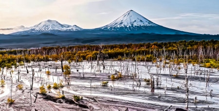 Vilyuchinsky volcano in Kamchatka. A stunning and majestic mountain landscape featuring a serene lake view that captivates viewers