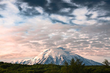 Tolbachik volcano with clouds at sunrise. Kamchatka peninsula, Russia. Beautiful summer landscape