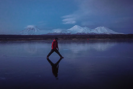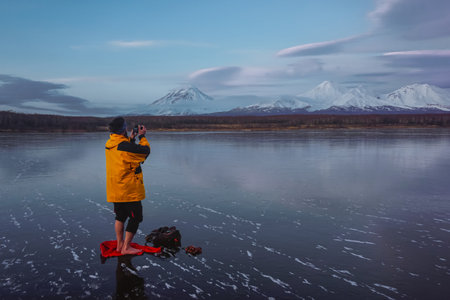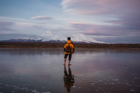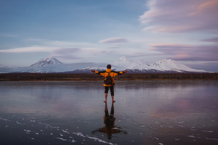 A Man on a Frozen Lake with a View of Kamchatka Volcanoes at sunset