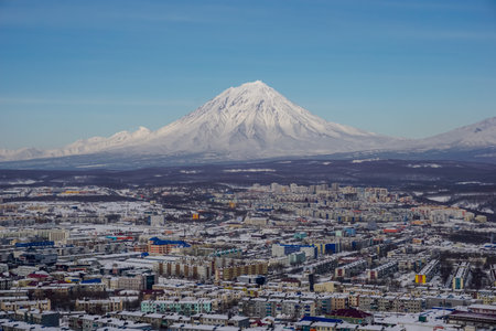 Avachinsky volcano towers over the city of Petropavlovsk-Kamchatsky on the Kamchatka Peninsula