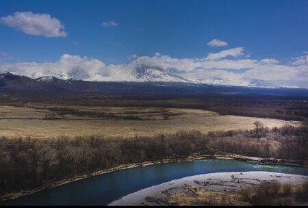 Panorama of Avacha river, Kamchatka peninsula. Early spring