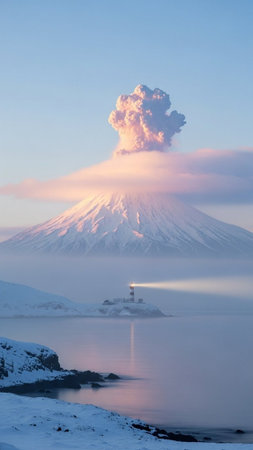 Lighthouse on coast of Pacific Ocean. Russian Far East, Kamchatka Peninsula, Petropavlovsk-Kamchatsky City. Lighthouse on the Stanitskiy Cape with Viluchinskiy volcano on the background. Picturesque place, seascape