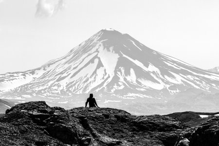 Black and white silhouette of the tourist looking on the peak of the mountain.