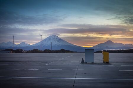 Landscape with views of volcanoes at Yelizovo airport, Kamchatka.