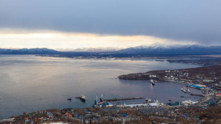 panoramic view of port in Petropavlovsk-Kamchatsky city from Mishennaya sopka on overcast spring evening, Kamchatka Krai, Russia