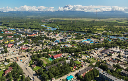 Yelizovo town on Kamchatka Peninsula. View from helicopter.