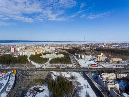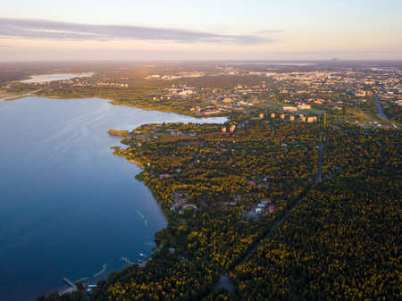 View from above on Petrozavodsk, the capital city of the Republic of Karelia and Lake Onega, Russia