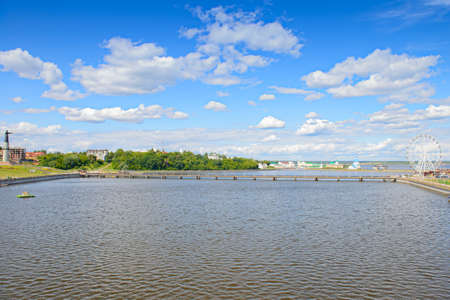 July 8, 2019: Pedestrian bridge across Cheboksary Bay. View from the height. Cheboksary. Russia.