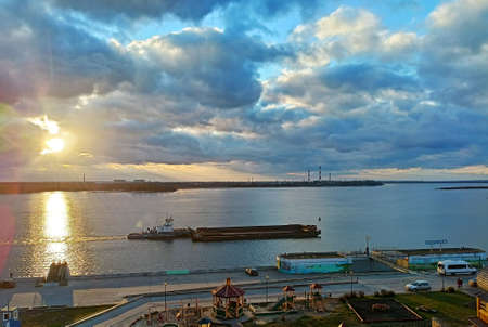 A barge on the Volga river and a beautiful cloudy sky at sunset